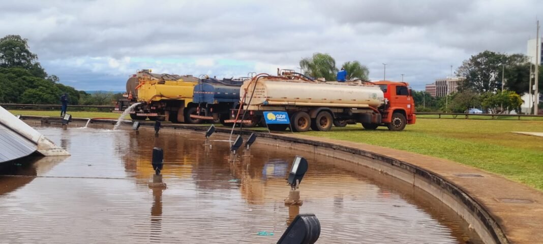 Após a limpeza, que incluiu remoção de possíveis criadouros do mosquito da dengue, caminhões-pipa preencheram o espelho-d’água até a altura dos fios dos refletores | Foto: GDF Presente