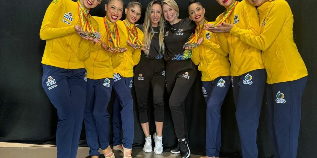 O conjunto brasileiro de ginástica rítmica arrematou o primeiro ouro da temporada e mais uma prata – a primeira fora obtida no sábado (11) – na etapa da Copa do Mundo, em Portimão (Portugal). Neste domingo (12), o time nacional (Deborah Medrado, Maria Eduarda Arakaki, Marianna Pinto, Nicole Pírcio, Sofia Madeira e Victória Borges) venceu a série mista ao somar 32,550 pontos. A prata ficou com o México (30.100) e o bronze com a Espanha (29.900).