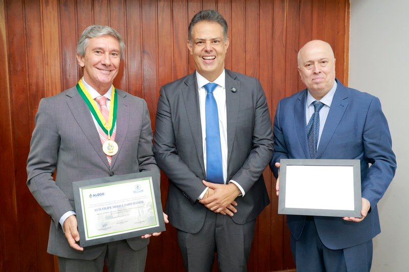 O deputado Eduardo Prado (PL) realizou, na manhã desta quinta-feira, 27, sessão solene de entrega de Título de Cidadania Goiana ao cônsul honorário de Portugal, José Pedro Martins dos Santos, e Medalha do Mérito Legislativo Pedro Ludovico Teixeira ao embaixador de Portugal no Brasil, Luís Felipe Faro Ramos. A solenidade aconteceu no auditório da sede do Tribunal Regional Eleitoral de Goiás (TRE-GO).