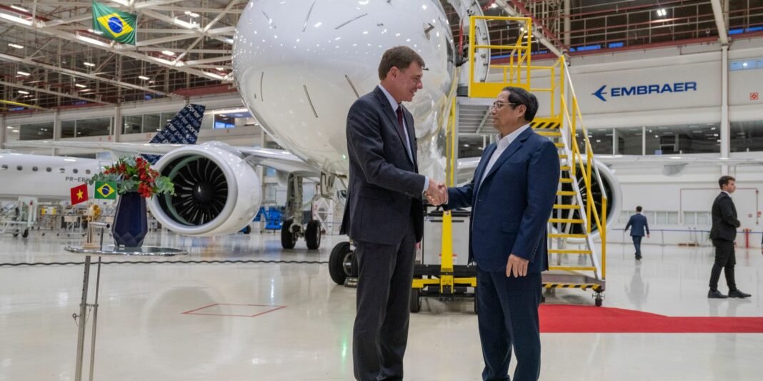O primeiro-ministro Pham Minh Chinh visitou a Embraer, em São José dos Campos, interior de São Paulo, na tarde de sábado (23), como parte de sua visita oficial ao Brasil. A delegação foi recebida pelo presidente da companhia Francisco Gomes Neto que apresentou ao líder vietnamita as inovações da empresa brasileira para o setor aeroespacial.